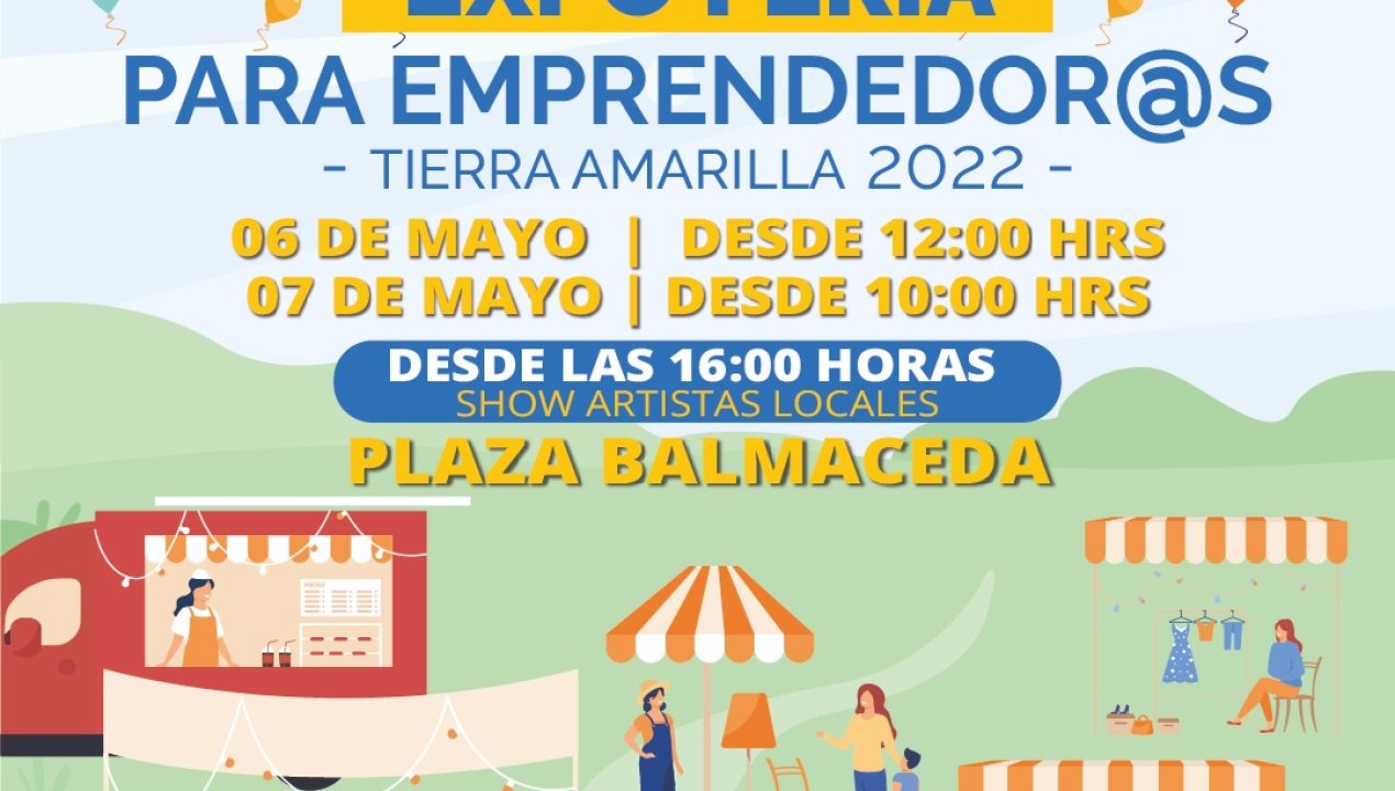 A partir de las 12:00 horas de este viernes 06 de mayo y con un corte de cinta por parte del Alcalde Cristóbal Zúñiga se dará inicio a la Expo Feria Emprendedor@s de Tierra Amarilla 2022, la cual se realizará en plaza Balmaceda, con el fin de incentivar y fomentar el desarrollo económico de las emprendedoras y emprendedores de la comuna, y que continuará durante la jornada del sábado.