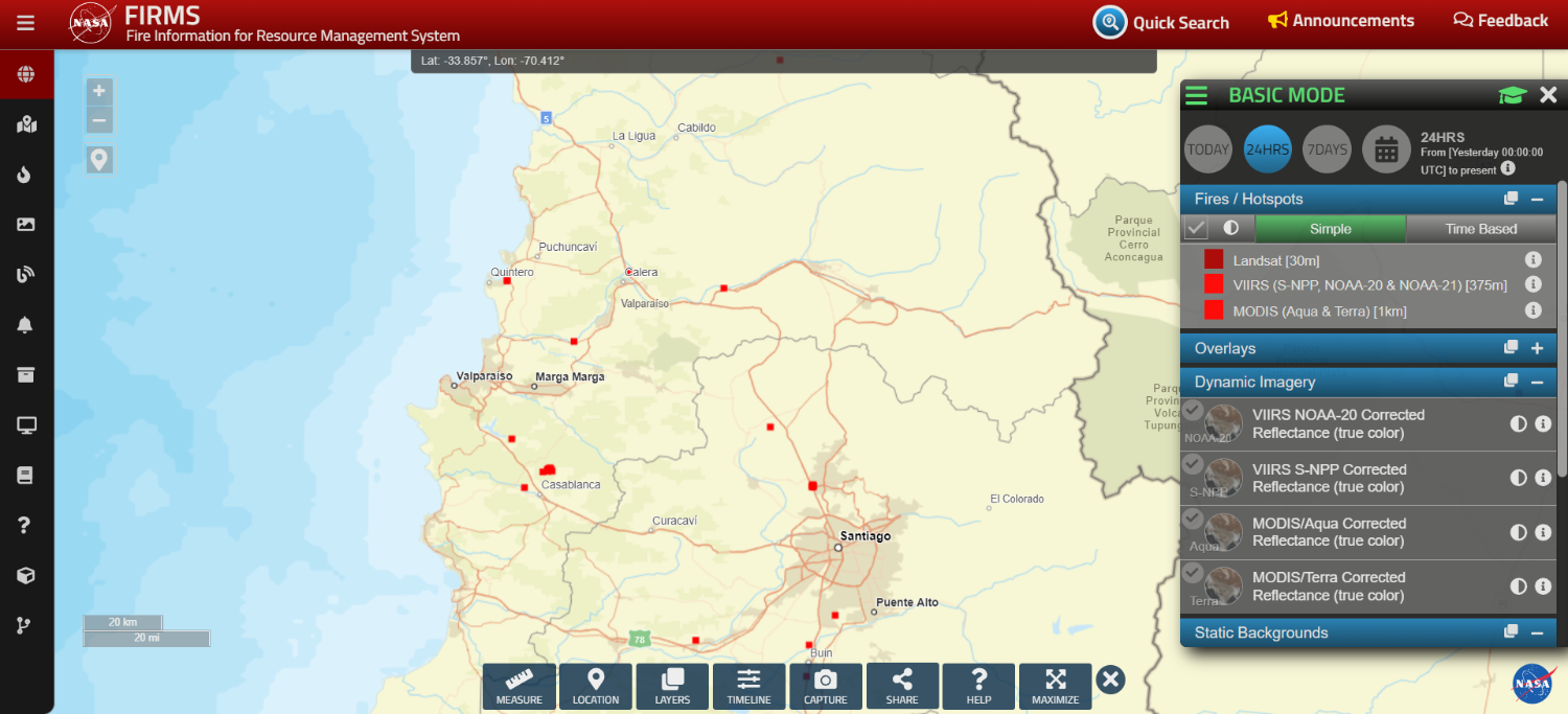 La NASA tiene un sistema compuesto por satélites llamado Fire Information for Resource Management System (FIRMS), el que permite ver en tiempo real las zonas que están siendo devastadas por los incendios forestales.