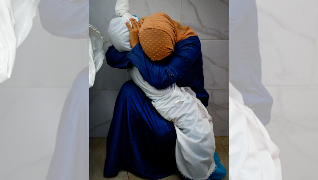 La imagen, que no muestra el rostro de ninguna de las dos, fue captada al momento que la mujer fue a la morgue del Hospital Nasser. La mujer fue luego de enterarse que la casa de su familia había sido bombardeada y no se encontraba nadie en el hogar.